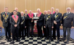 At the meeting of Crossed Keys Chapter No 629 on Monday 6th March 2023 Ill. Bro. John Mansfield was Enthroned as Most Wise Sovereign. Ill. Bro. Ian Stevenson of Grays and Eagle Chapter No 464 was in attendance to present Ill. Bro. John with the Travelling Rose as it continues its journey around the Chapters of the District. He said how pleased and proud he was to be able to make the presentation on behalf of his Chapter.