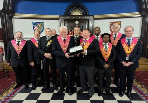 next phase of the Travelling Rose’s journey took place at the Prittlewell St Mary Chapter meeting on 25th November, 2022. The Travelling Rose was presented to the Most Wise Sovereign, E&P. Bro. Trevor Jewell, by Ill. Bro. Jim Smith, MWS of Essex Chapter No 894. He was accompanied by Ill. Bro. Colin Innes and a significant number of 894 members were also present. E&P. Bro. Trevor thanked Ill. Bro. Jim for making the presentation and presented him with a cheque for the charity of his choice – Christians Against Poverty.