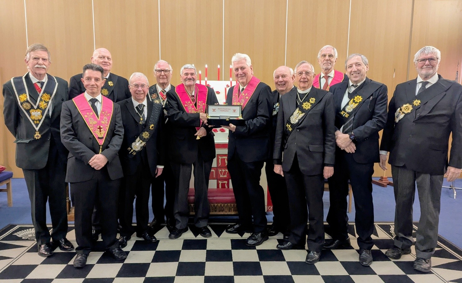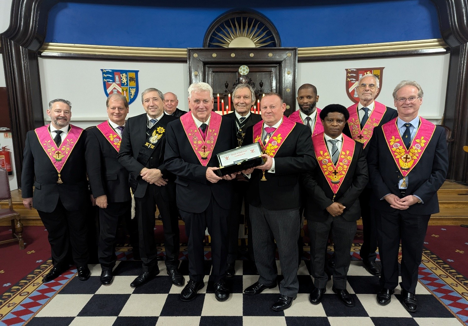 The Travelling Rose was introduced to members of the South Essex Sovereigns Chapter – Essex Chapter No 894 – on Monday 31st October 2022. It was presented to the Most Wise Sovereign, Ill. Bro. Jim Smith 30o by the Inspector General, V.Ill. Bro. John Reginald Hubbard 33o.