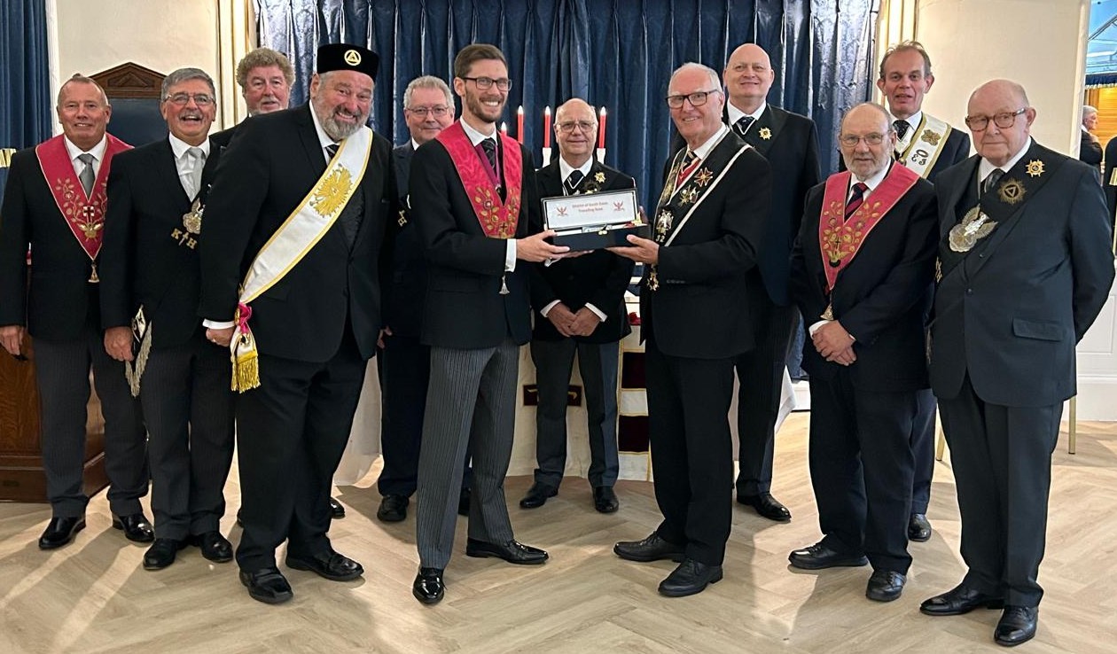 The Travelling Rose arrived at The Southend Masonic Centre on its 29th Chapter visit since beginning its journey in October 2022. E&P Bro. David Nice received the Rose from E&P Bro. John Letham, supported by a number of Princes from the Stanley Frohnsdorff Chapter. All were able to enjoy a first-class Perfection ceremony following which the Chapter of Eternity presented a donation of £100 to Stanley Frohnsdorff’s chosen charity, the St Francis Hospice. The Chapter of Eternity hospitality continued with a most enjoyable festive board which finished off an excellent afternoon and evening for all. The Travelling Rose will be on the move again when members from The Chapter of Eternity will journey to Upminster Masonic Hall. They will make a presentation to Essex Quadrant Chapter as the Rose continues its journey around the District of South Essex.